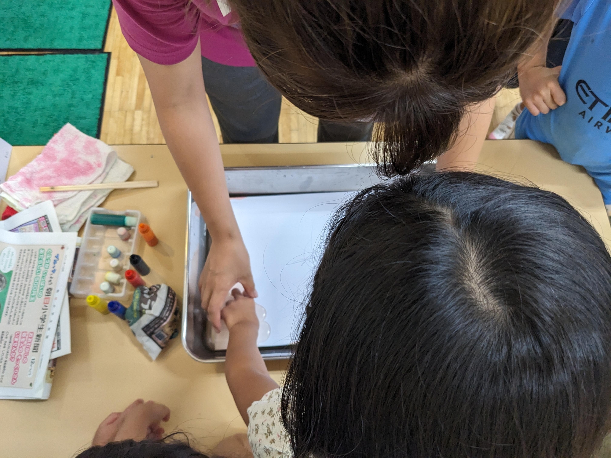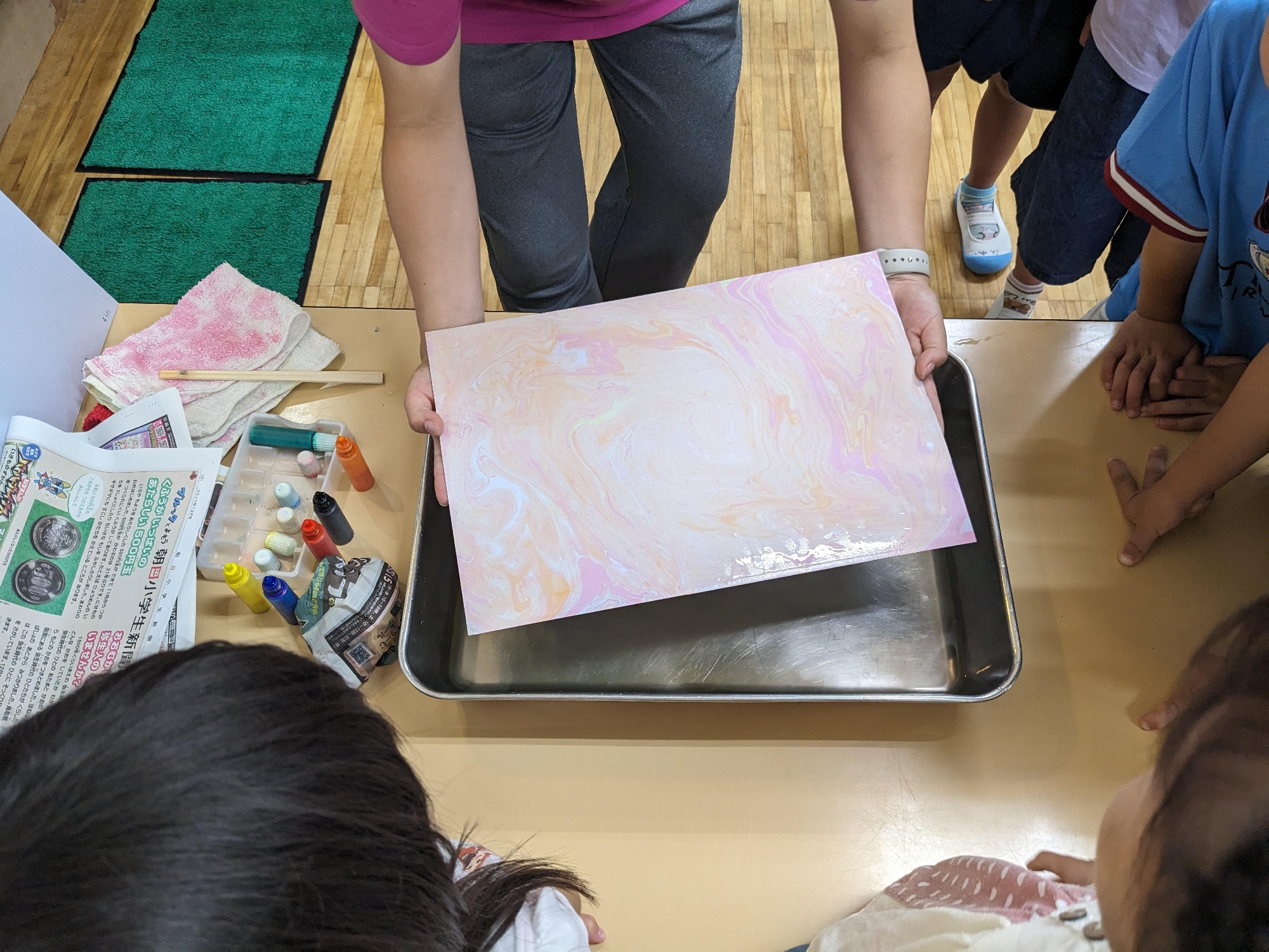 先生と一緒に紙を水面におろします。