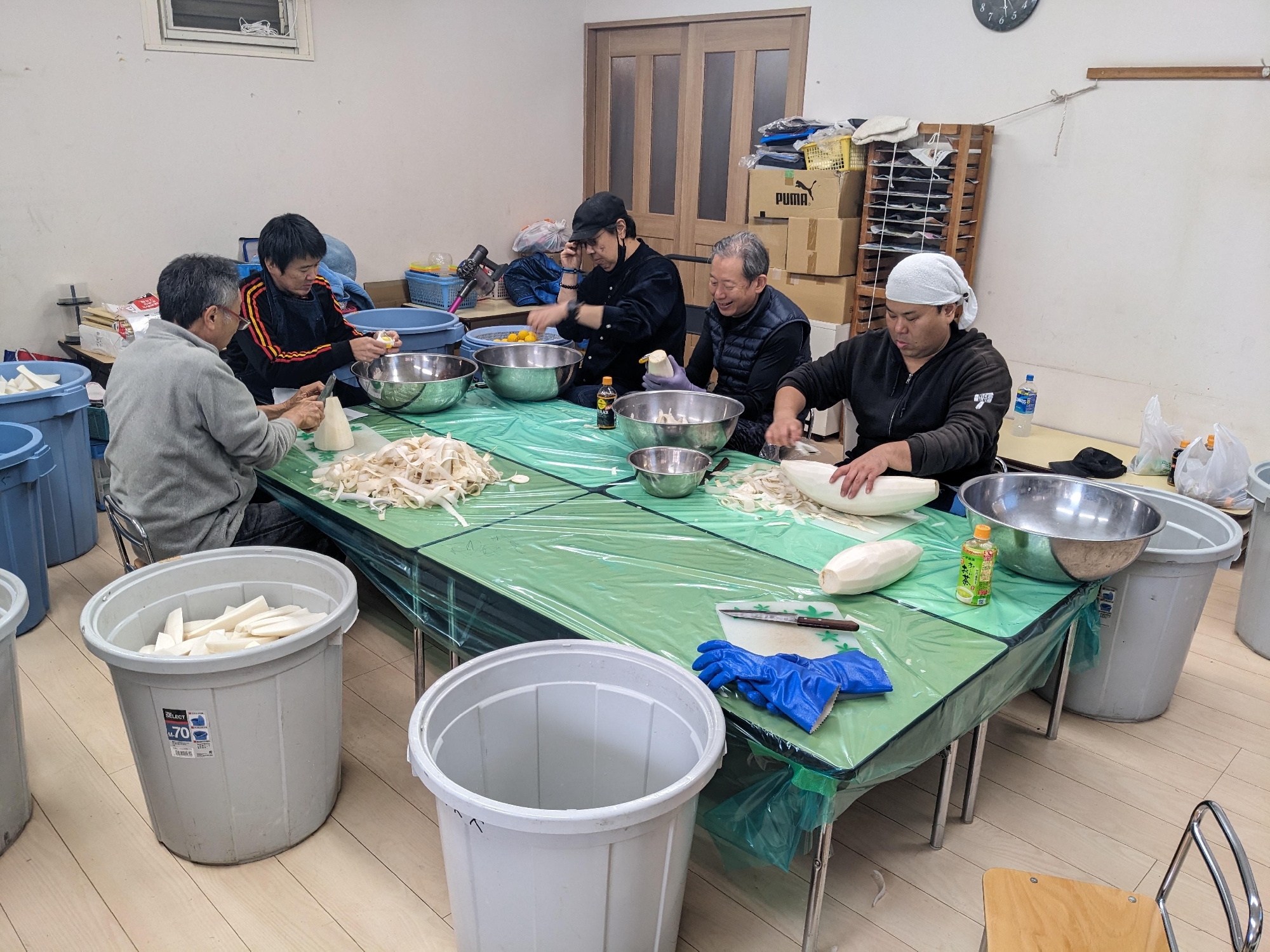 まずは大根洗いを3人でやります。1人50本計算ですね。