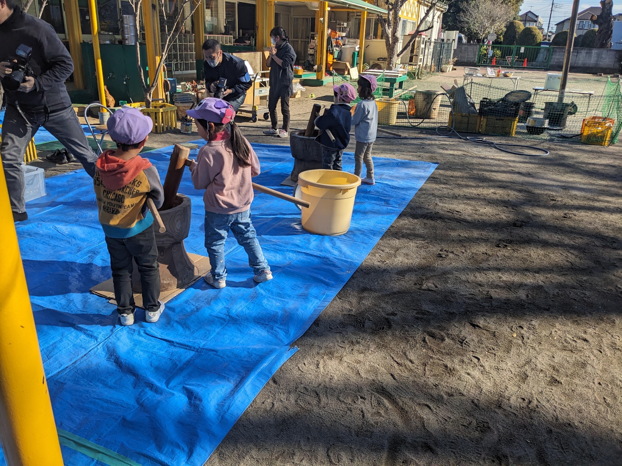 幼稚園児だけでお餅をつくのはむずかしいので、