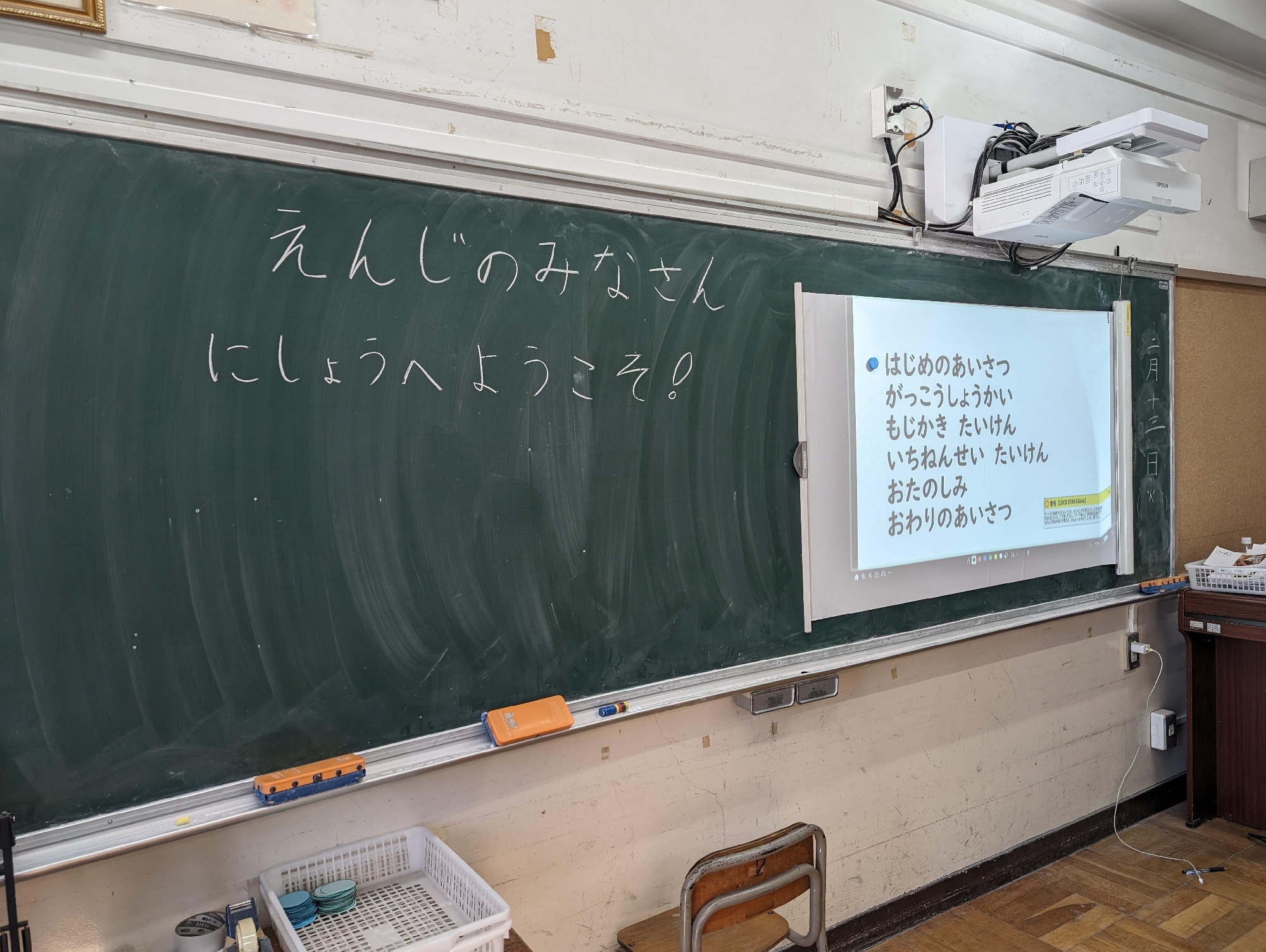 別のグループは教室で教科書を見たり、名前を書いたり、ランドセルを背負わせてもらったりしました。