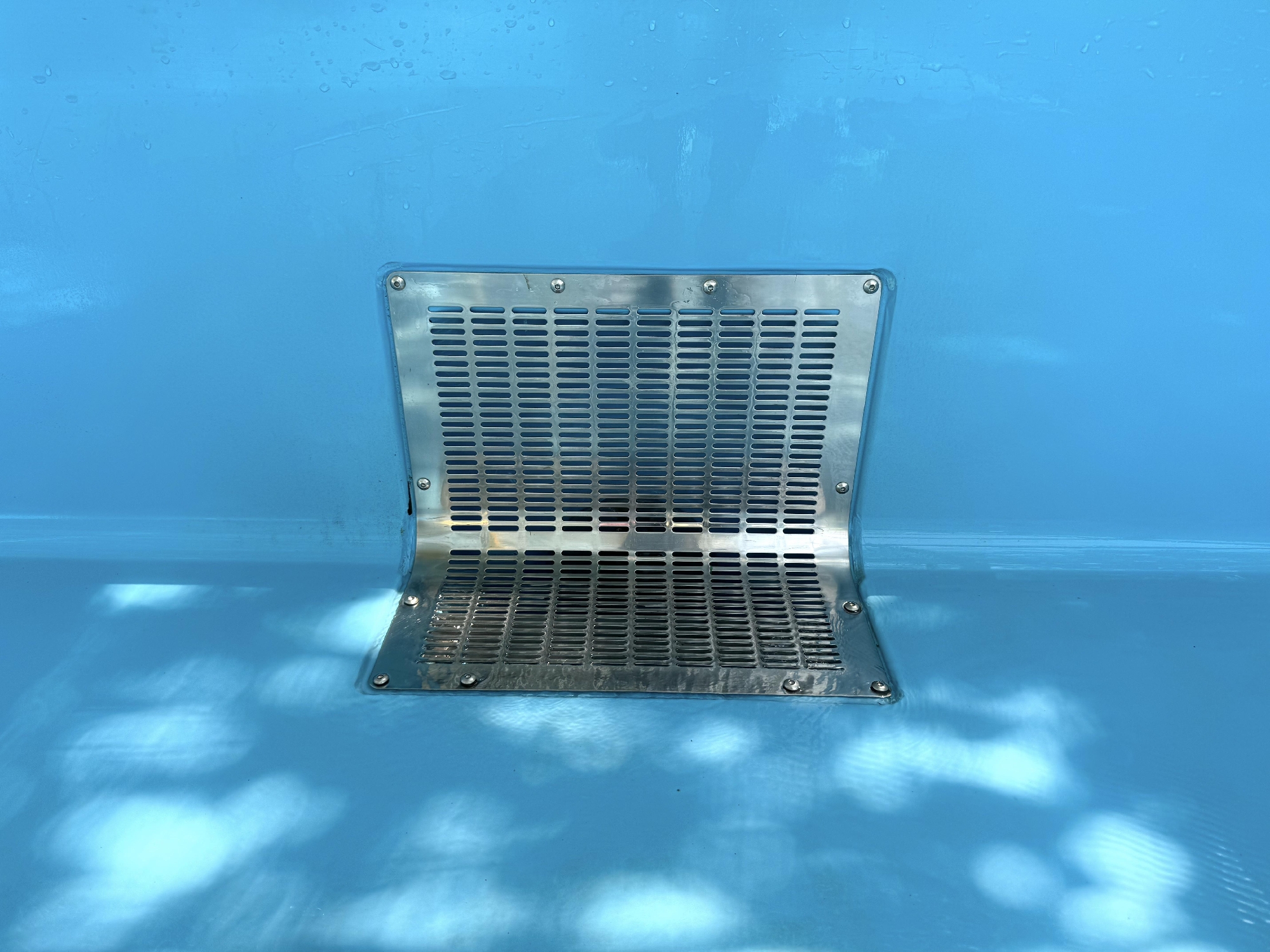 排水口です。ニュースなどでよく見かける事故に、循環用排水口に吸い込まれる事案がありますが、園のプールは循環機能はありません。そのため、3日に1度は水を入れ替えています。