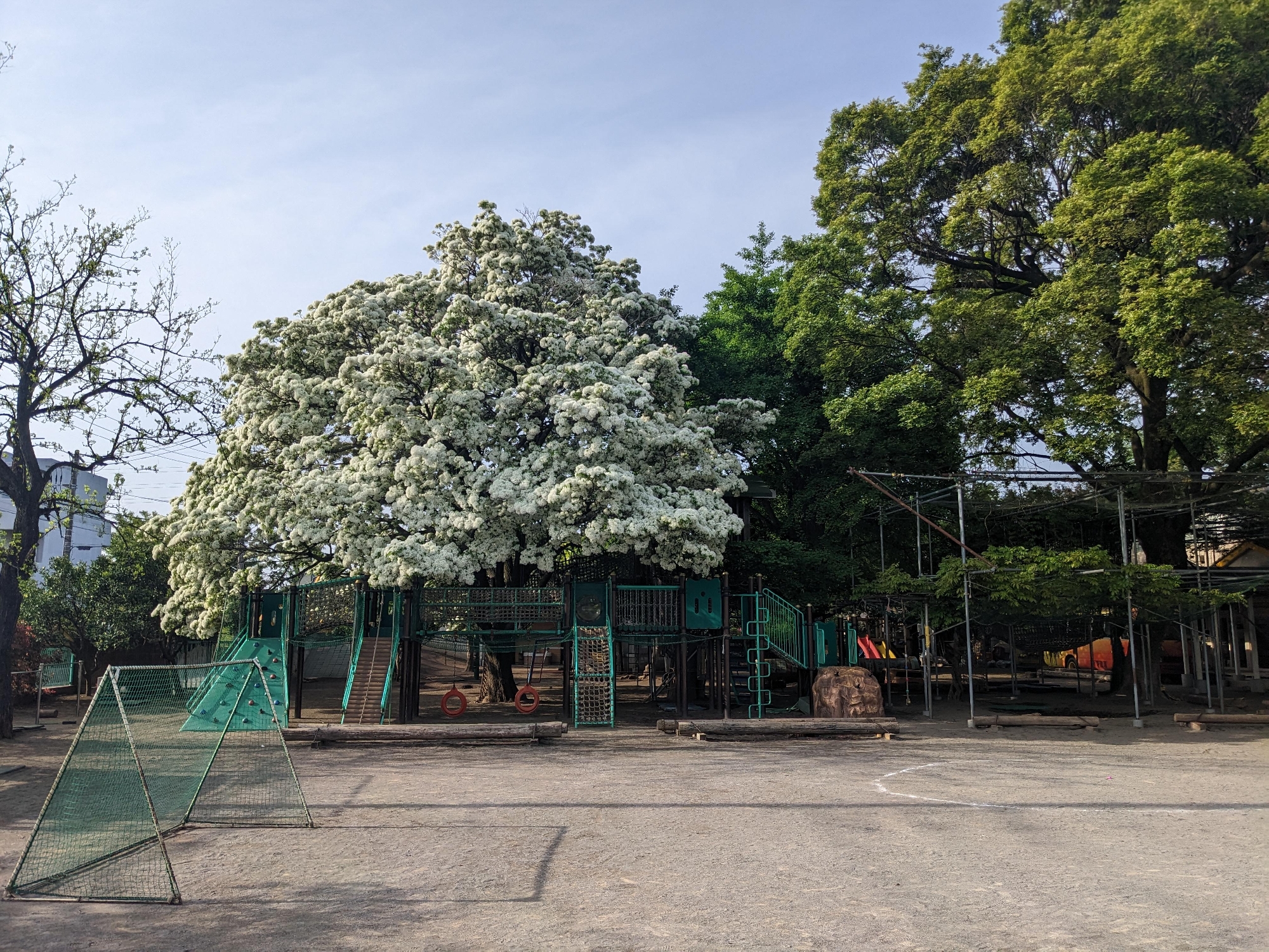 幼稚園のなんじゃもんじゃ(ヒトツバタゴ)の木が満開です。