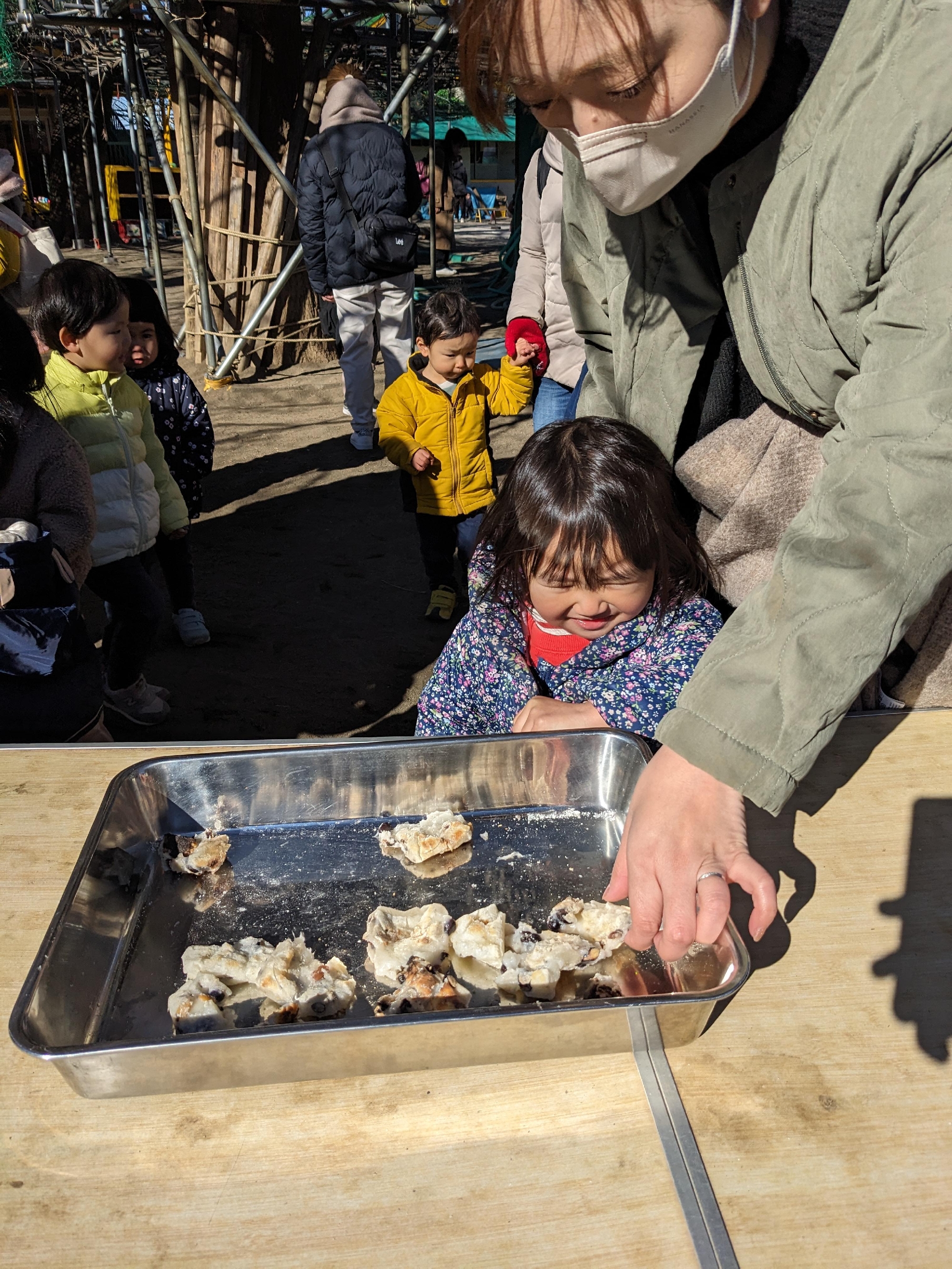 ちょっと熱いので保護者の皆さんに取ってもらいました。
