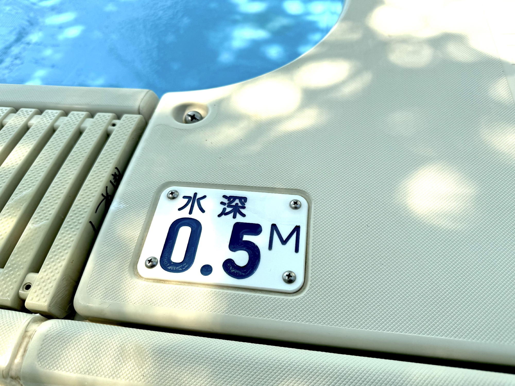 排水口です。ニュースなどでよく見かける事故に、循環用排水口に吸い込まれる事案がありますが、園のプールは循環機能はありません。そのため、3日に1度は水を入れ替えています。