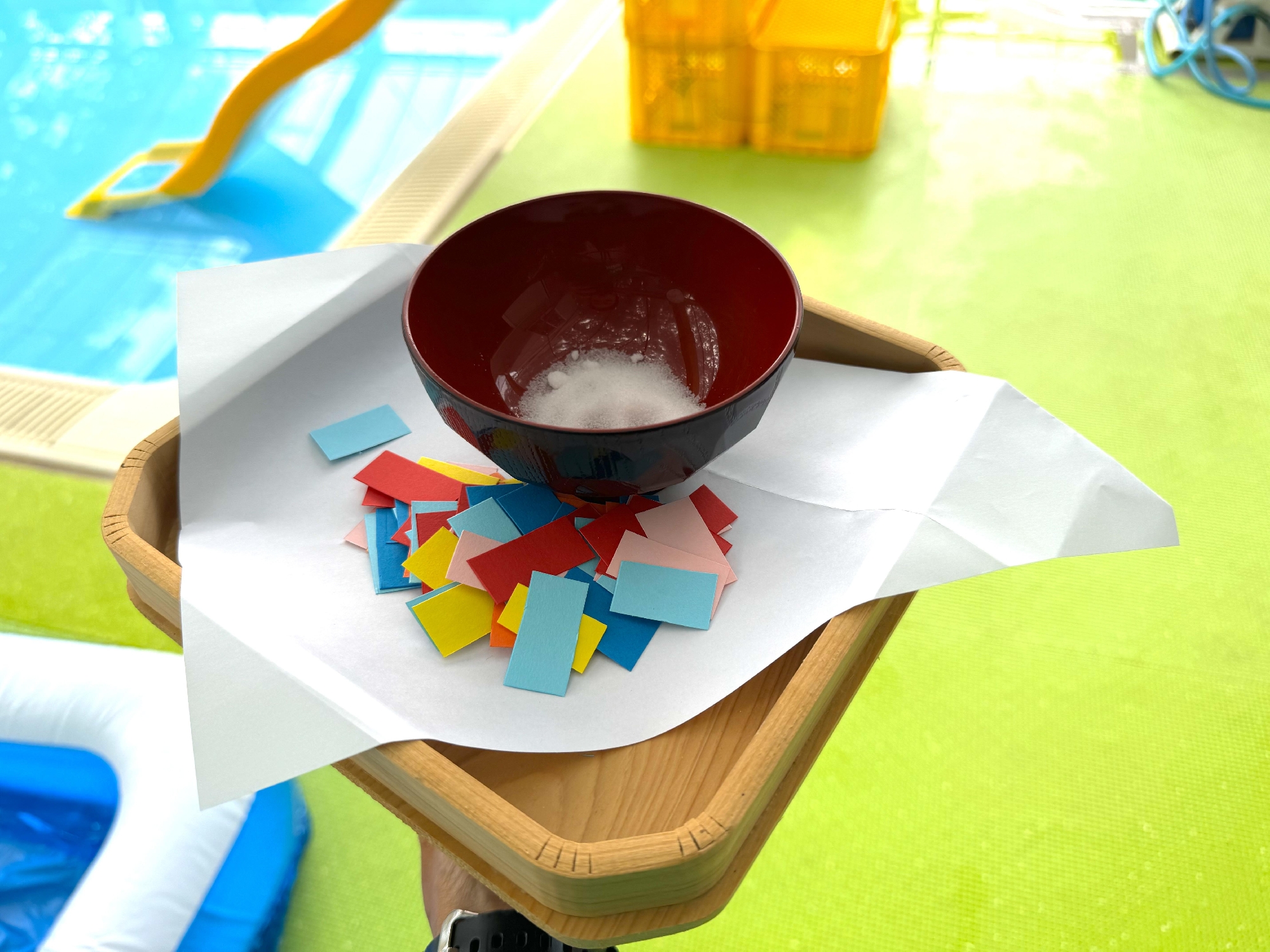 お塩を少しだけと五色の紙もプールに撒いて